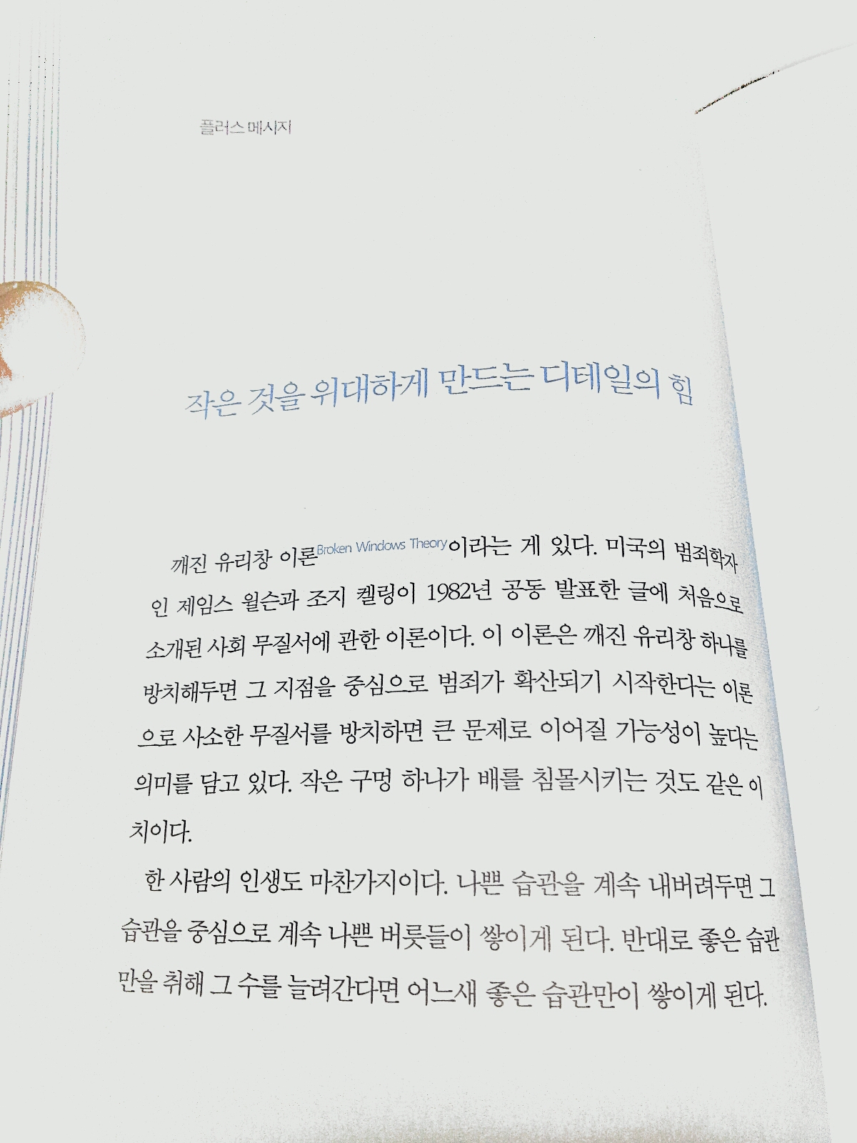 한 사람의 인생도 마찬가지이다. 나쁜 습관을 계속 내버려두면 그 습관을 중심으로 계속 나쁜 버릇들이 쌓이게 된다. 반대로 좋은 습관만을 취해 그 수를 늘려간다면 어느새 좋은 습관만이 쌓이게 된다.