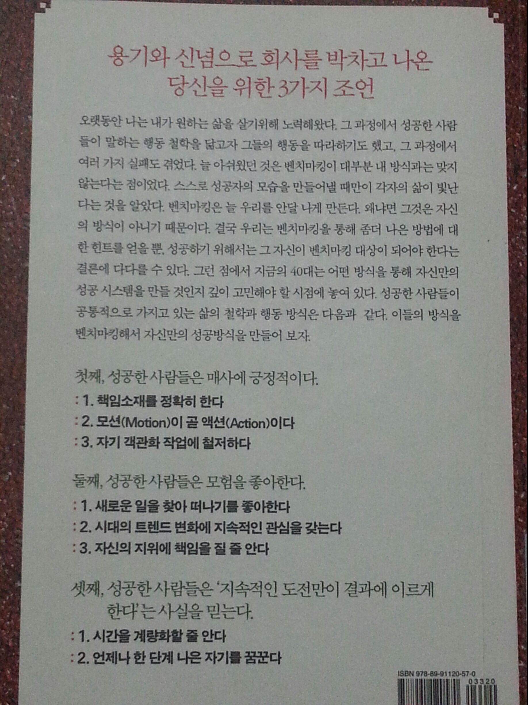 오랫동안 나는 내가 원하는 삶을 살기 위해 노력해왔다. 그 과정에서 성공한 사람들이 말하는 행동 철학을 닮고자 그들의 행동을 따라 하기도 했고, 그 과정에서 여러 가지 실패도 겪었다. 늘 아쉬웠던 것은 벤치마킹이 대부분 내 방식과는 맞지 않는다는 점이었다. 스스로 성공자의 모습을 만들어낼 때만이 각자의 삶이 빛난다는 것을 알았다. 벤치마킹은 늘 우리를 안달 나게 만든다. 왜냐면 그것은 자신의 방식이 아니기 때문이다. 결국 우리는 벤치마킹을 통해 좀 더 나은 방법에 대한 힌트를 얻을 뿐. 성공하기 위해서는 그 자신이 벤치마킹 대상이 되어야 한다는 결론에 다다를 수 있다. 그런 점에서 지금의 40대는 어떤 방식을 통해 자신만의 성공 시스템을 만들 것인지 깊이 고민해야 할 시점에 놓여 있다. 성공한 사람들이 공통적으로 가지고 있는 삶의 철학과 행동 방식은 다음과 같다. 이들의 방식을 벤치마킹해서 자신만의 성공방식을 만들어 보자.