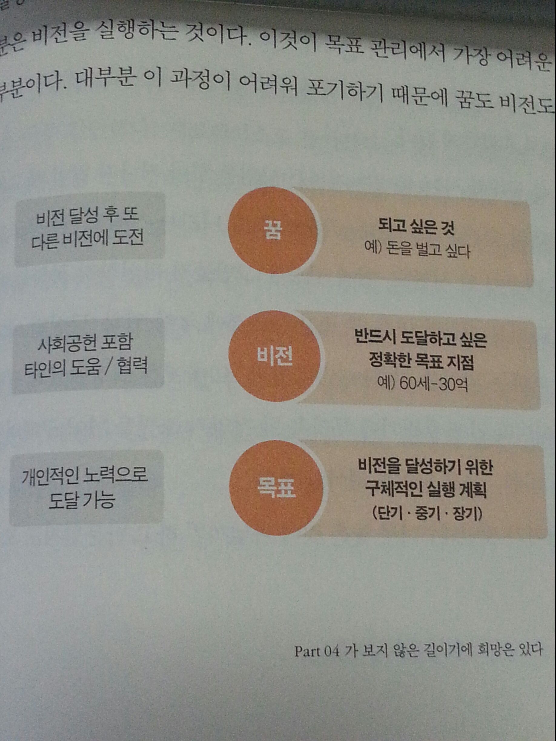 2. 언제나 한 단계 나은 자기를 꿈꾼다지금 40대에게 필요한 것은 세계화 시스템을 넘어설 수 있는 경쟁력을 갖는 것이다.기회라는 것이 대부분은 승자독식이다.승자독식 체제를 만들어놓고 사람들에게 노력하지 않아서 힘들다고 말하는 것은 또 다른 경제적 폭력이다.1인 기업가의 특징을 다음과 같이 보았다.자신을 남들과 차별화할 수 있는 길을 찾아 그 길을 가는 사람들이죠. 성공하든 실패하든 그 책임이 자신에게 귀결되기 때문에 1인 기업가는 꿈이 있어야합니다. 미국의 패션 디자이너 랄프 로렌은 옷이 아니라 꿈을 디자인했고, 나이키는 운동화가 아니라 승리라는 개념을 팔았죠창조적 단절1. 정보중독증2. 멀티태스킹형 주의력결핍증 - 공두개로 축구를 하는 현상사람들이 알면서도 행동하지 못해 고통을 느끼는 이유는 개인이 알고 있는 지식이 머리에서 가슴으로 다가와 지혜와 통찰력이 되어 행동으로 이어지는 과정이 일어나지 않기 때문이다.성공과 관련된 책의 대부분은 삶의 태도를 다룬다. 결국 교육을 많이 받거나 책을 읽는다 하더라도 삶의 태도를 근본적으로 개혁하지 않는다면, 성공에 대한 염원만큼이나 허탈함을 경험하게 된다.목표가 있는 인생을 살아야한다. 자신의 분야에 실력을 가져라. 실행력을 높혀야한다. 긍정적인 마인드로 살아야한다. 장기적 관점으로 선택하는 능력을 높혀라. 이미 당신도 알고 있는 진부하기 짝이 없는 것들이다.행동해야 한다는 강박관념과 행동하는 것은 별개의 일이지만 말이다.1. 성찰의 시간을 갖고 잃어버린 꿈을 찾아본다.내면의 목소리에 귀를 기울이는 것이 좋다. 그리고 의무감 때문에 미뤄왔던 것들을 하나둘 적어보자. 아주 사소한 것이라도 좋다.2. 그 꿈이 실현 가능한지를 점검해본다캐나다 통계청에 따르면, 한 해에만 40만개의 직업이 새로 생겨난다고 한다. 꿈의 목록에서 자신의 역량과 관련하여 새로운 직업이 될 수 있는 분야를 3가지만 적어 본다.3. 장기 목표와 단기 목표를 설정한다.자신이 정한 3가지 분야에서 전문적인 역량을 갖추기 위해 필요한 기간을 설정하고 장기 중기 단기 목표로 세분화 한다.4. 에너지 총량 법칙을 적용한다.분산된 에너지를 모으고, 낭비된 시간을 찾아 단기 목표에 적혀 있는 것들을 실천한다. 하루 3시간을 기준으로 하되 1주일 20시간은 반드시 투자하여 1만 시간의 법칙이 역량으로 연결될 수 있도록 단련한다.5. 세상의 변화와 균형을 유지한다.준비하고 있는 일이 시대 변화에 따라 일시적 유행업종인지, 아니면 사양업종이 되어 가는지 항상 안테나를 세우고 관찰한다.6. 다가올 변화에 조금만 앞서 가려는 노력을 한다.준비하고 있는 일의 시장 진입 시기를 냉철하게 판단해 본다. 너무 빨라도 힘들고 너무 늦어도 힘들다. 판단 할 수 없다면 투잡의 개념으로 접근해 보는 것도 현명한다. 감이 잡히지 않는다면 해당 분야 전문가를 찾아 상담을 하면 실전을 배울 수 있다.7. 위기를 기회로 전환하기 위해 마음을 다 잡는다.누구에게나 상승기와 하강기가 있게 마련이다. 위기는 늘 그 사람의 능력을 제대로 알 수 있는 기회일 수 있다. 철저히 준비되었다면 새로운 세상으로 나아가는 것도 좋은 전환이 될 수 있다. 하지만 준비되지 않았다면 쓸데 없는 자존심은 버리고 최대한 조직에 머무는 기간을 늘리는 것이 좋다.8. 도전정신과 지속적인 인내력을 갖는다.조급함은 성취의 적이다. 빨리 승부를 보려는 것이 시대정신이 되어간다. 하지만 도전정신과 지속적인 인내력 없이 놀라운 성취를 이룬 사람을 찾아보기 힘든 것도 엄연한 현실이다. 인생은 화려함보다는 삶의 체험현장이란 사실을 다시 한 번 떠올리자.9. 원하는 것을 이루기 위한 이미지 트레이닝을 한다.먼저 자기 자신에게 긍정적인 에너지를 줘야한다. 출근길에 자존감을 높이는 대화를 할 수 있다면 더 없이 좋다. 부정적인 영향을 주고, 잠재력을 죽이는 사람들은 멀리할 필요가 있다. 희망의 에너지를 주는 사람과 자주 대화하면서, 당신의 목표를 하나둘 구체화 시킨다. 긍정적인 에너지를 만들기 위해 꾸준히 운동하는 것도 좋은 방법이다.10. 자원을 최대한 활용한다.우선 아내와 가족에게 당신의 비전을 설명하고, 그들을 후원자로 만든다. 다음으로 멘토를 최대한 활용한다. 그리고 업무로 알았던 인재풀을 가동해 당신이 준비하는 일의 후원자가 되도록 하라. 그들과 나누는 대화는 앞으로 독립을 하든 다른 회사로 옮기든 간에 큰 도움이 될 것이다. 또한 헤드헌트 업체와도 지속적인 관계를 유지하여 자신의 강점과 약점을 보완한다.