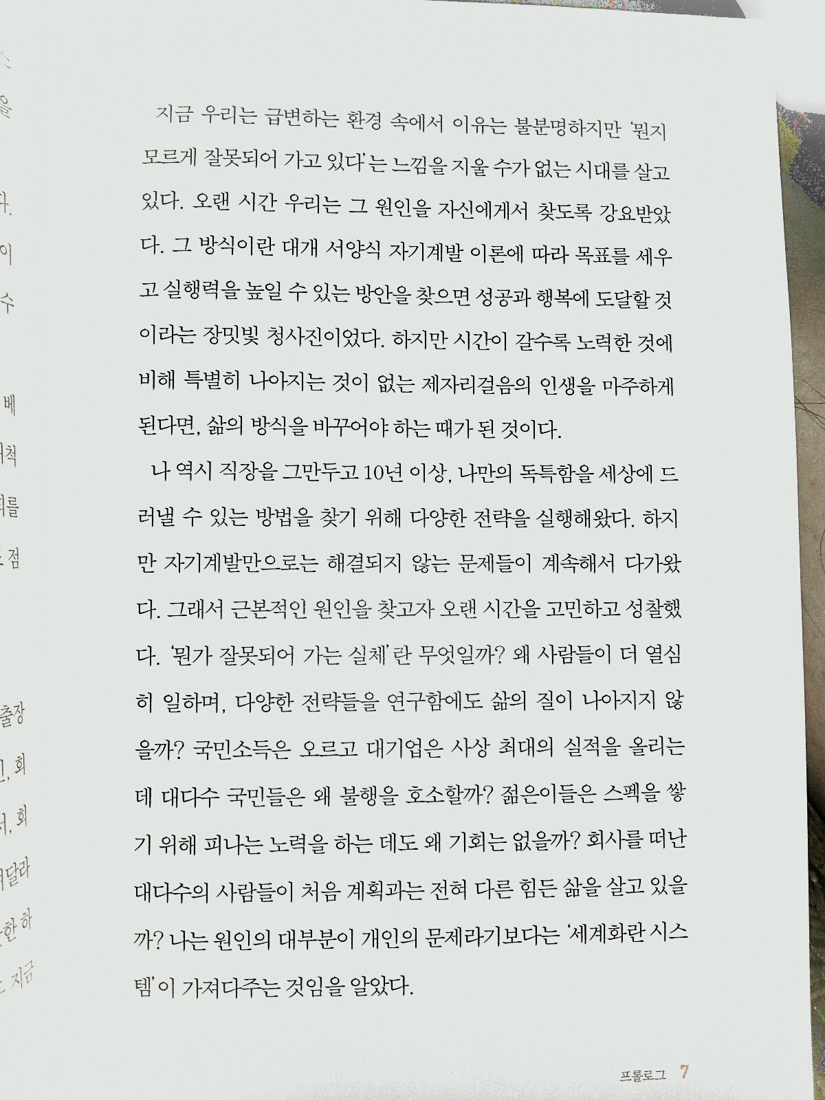그 방식이란 대개 서양식 자기계발 이론에 따라 목표를 세우고 실행력을 높일 수있는 방안을 찾으면 성공과 행복에 도달할 것이라는 장밋빛 청사진이었다.하지만 시간이 갈수록 노력한 것에 비해 특별히 나아지는 것이 없는 제자리걸음의 인생을 마주하게 된다면, 삶의 방식을 바꾸어야 하는 때가 된 것이다.나 역시 직장을 그만두고 10년 이상, 나만의 독특함을 세상에 드러낼 수 있는 방법을 찾기 위해 다양한 전략을 실행해왔다. 하지만 자기계발만으로는 해결되지 않는 문제들이 계속해서 다가왔다. 그래서 근본적인 원인을 찾고자 오랜시간을 고민하고 성찰했다. 뭔가 잘못되어 가는 실체란 무엇일까? 왜 사람들이 더 열심히 일하며, 다양한 전략들을 연구함에도 삶의 질이 나아지지 않을까? 국민소득은 오르고 대기업은 사상 최대의 실적을 올리는 데 대다수 국민들은 왜 불행을 호소할까? 젊은이들은 스펙을 쌓기 위해 피나는 노력을 하는 데도 왜 기회는 없을까? 회사를 떠난 대다수의 사람들이 처음 계획과는 전혀 다른 힘든 삶을 살고 있을까?나는 원인의 대부분이 개인의 문제라기보다는 세계화란 시스템이 가져다주는 것임을 알았다.