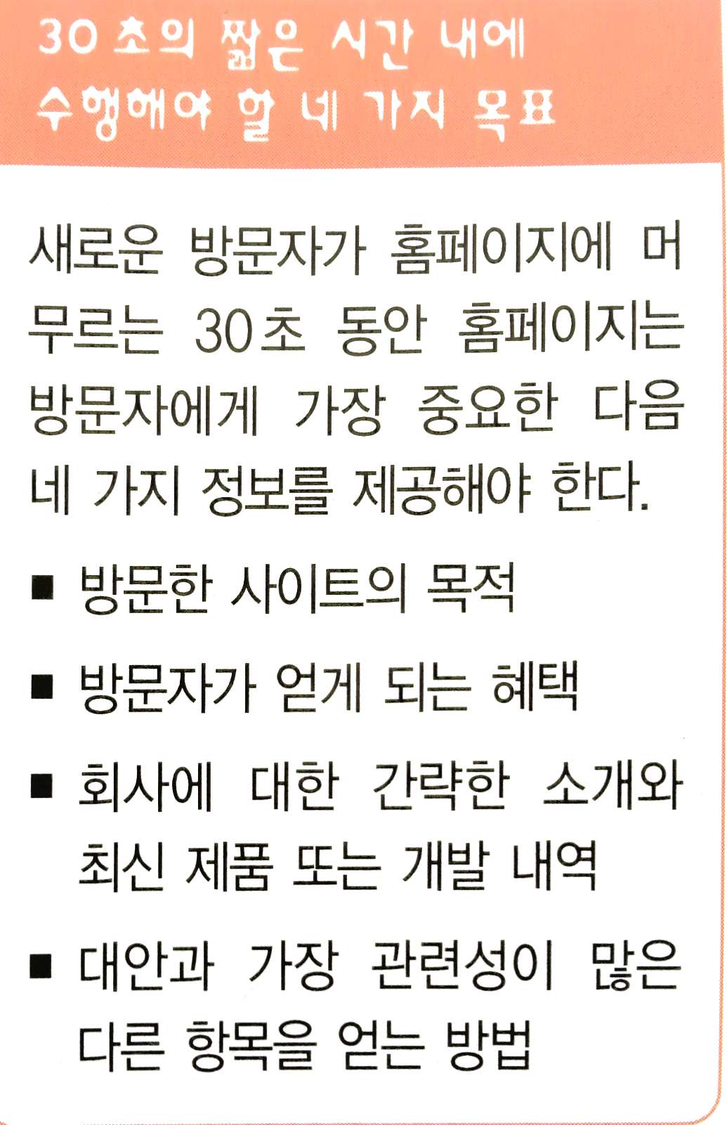 대부분의 사람들은 웹이 아름답기 때문에 방문하는 것이 아니라 웹을 활용하기 위해 방문한다. 물론 시각적으로 호소력이 있는 사이트를 갖는 것도 좋지만 무엇보다 내용이 가장 중요하다.