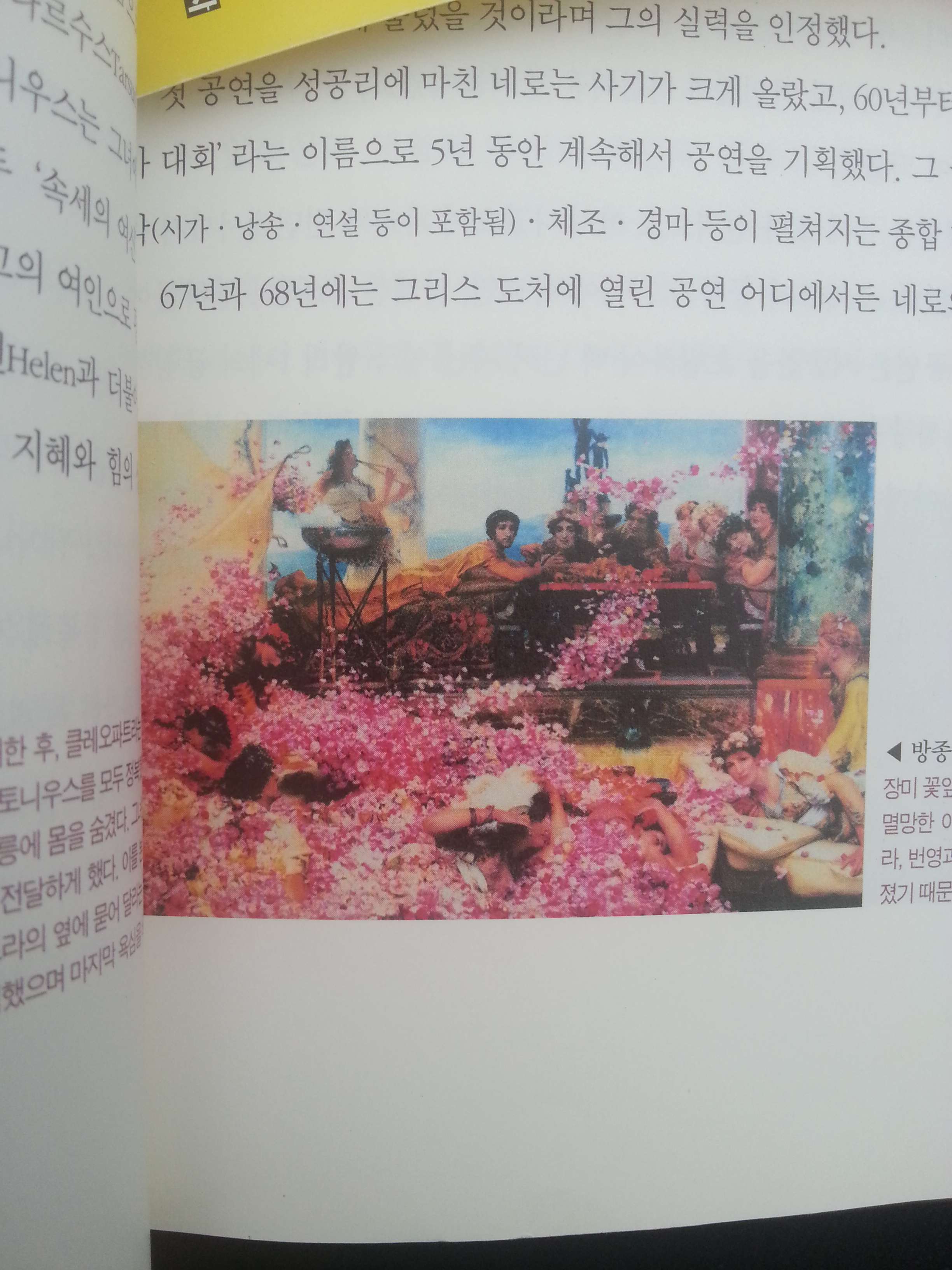 장미 꽃잎 더미 속에 타락한 영혼들이 숨어 있다. 로마 제국이 멸망한 이유는 가난한 병사가 무력을 남용했기 때문이 아니라, 번영과 안정이 가져온 타락과 죄악으로 인해 도덕이 사라졌기 때문이다.