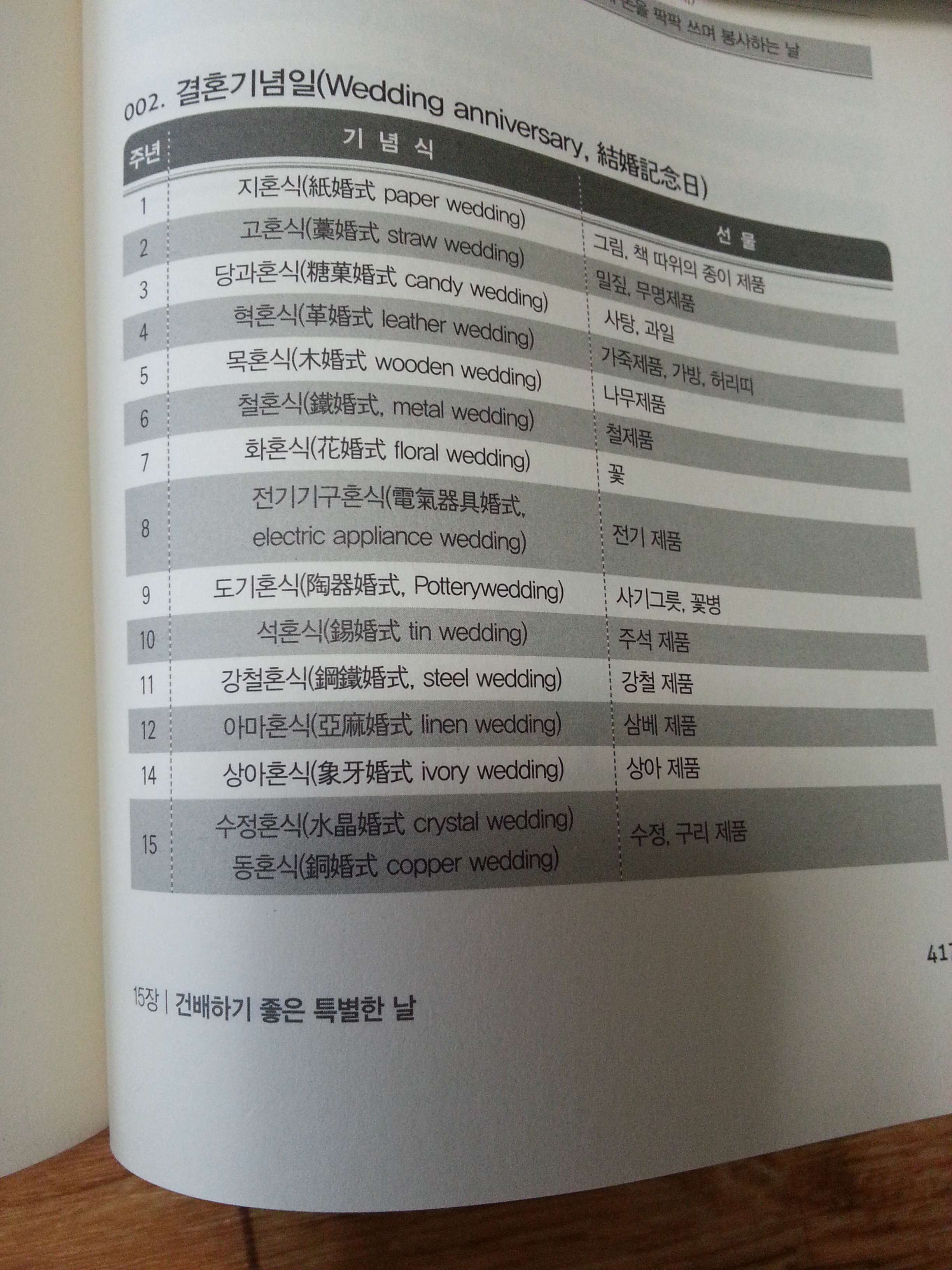 1 지혼식(紙婚式) Paper wedding 종이 제품 2 고혼식(藁婚式) Straw wedding 밀짚, 책 3 당과혼식(糖菓婚式) Candy wedding 사탕, 과일 4 혁혼식(革婚式) Leather wedding 가죽제품, 가방, 허리띠 5 목혼식(木婚式) Wooden wedding 나무제품 6 철혼식(鐵婚式) Metal wedding 철제품 7 화혼식(花婚式) Floral wedding 꽃 8 전기기구혼식(電氣器具婚式) Electric appliance wedding 전기 제품 9 도기혼식(陶器婚式) Pottery wedding 사기그릇, 꽃병 10 석혼식(錫婚式) Tin wedding 주석 제품 11 강철혼식(鋼鐵婚式) Steel wedding 강철 제품 12 아마혼식(亞麻婚式) Linen wedding 삼베 제품 14 상아혼식(象牙婚式) Ivory wedding 상아 제품 15 수정혼식(水晶婚式) Crystal wedding 수정, 구리 제품 15 동혼식(銅婚式) Copper wedding 구리 제품 20 자기혼식(磁器婚式) China wedding 도자기 25 도혼식(陶婚式) Silver wedding 은 제품 30 진주혼식(眞珠婚式) Pearl wedding 진주 제품 35 산호혼식(珊瑚婚式) Coral wedding 산호, 비취 제품 40 홍옥혼식(紅玉婚式) Ruby wedding 모직제품, 에머랄드, 루비제품 45 청옥혼식(靑玉婚式) 사파이어혼식(Sapphire wedding) 사파이어 제품 50 금혼식(金婚式) Golden wedding 금 제품 55 에메랄드혼식(Emerald wedding) 에메랄드 제품 60 회혼식(回婚式) 가장 소중한 것 65 블루사파이어혼식(Blue Sapphire wedding) 블루사파이어 제품(영국왕실에서 유래) 75 금강혼식(金剛婚式) Diamond wedding 다이아몬드 '오래전에 읽은 책들 > 2015년 읽은 책' 카테고리의 다른 글
