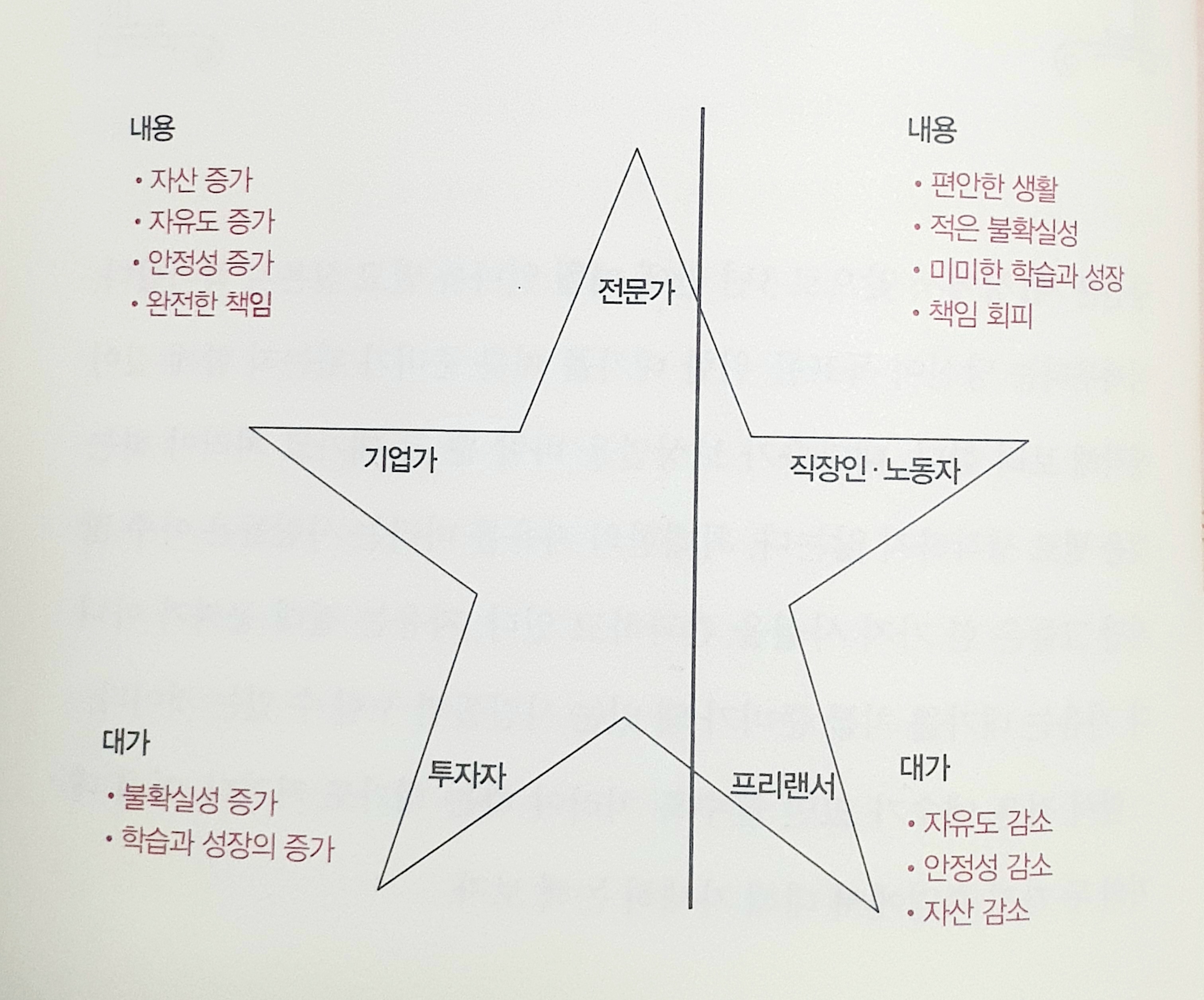 위험을 감수하지 않는다면 별의 왼쪽 분야에서는 돈을 벌 수 없다. 실질적인 지식이 없다면 전문가는 어릿광대일 뿐이다. 기업가라면 잠재적인 파산자이고, 투자자라면 아마추어 투기꾼에 불과하다. 정말 돈을 많이 벌고 싶다면 무엇보다 불확실성을 감수하고 끊임없는 학습과 성장하겠다는 마음가짐을 우선적으로 갖춰야 한다.