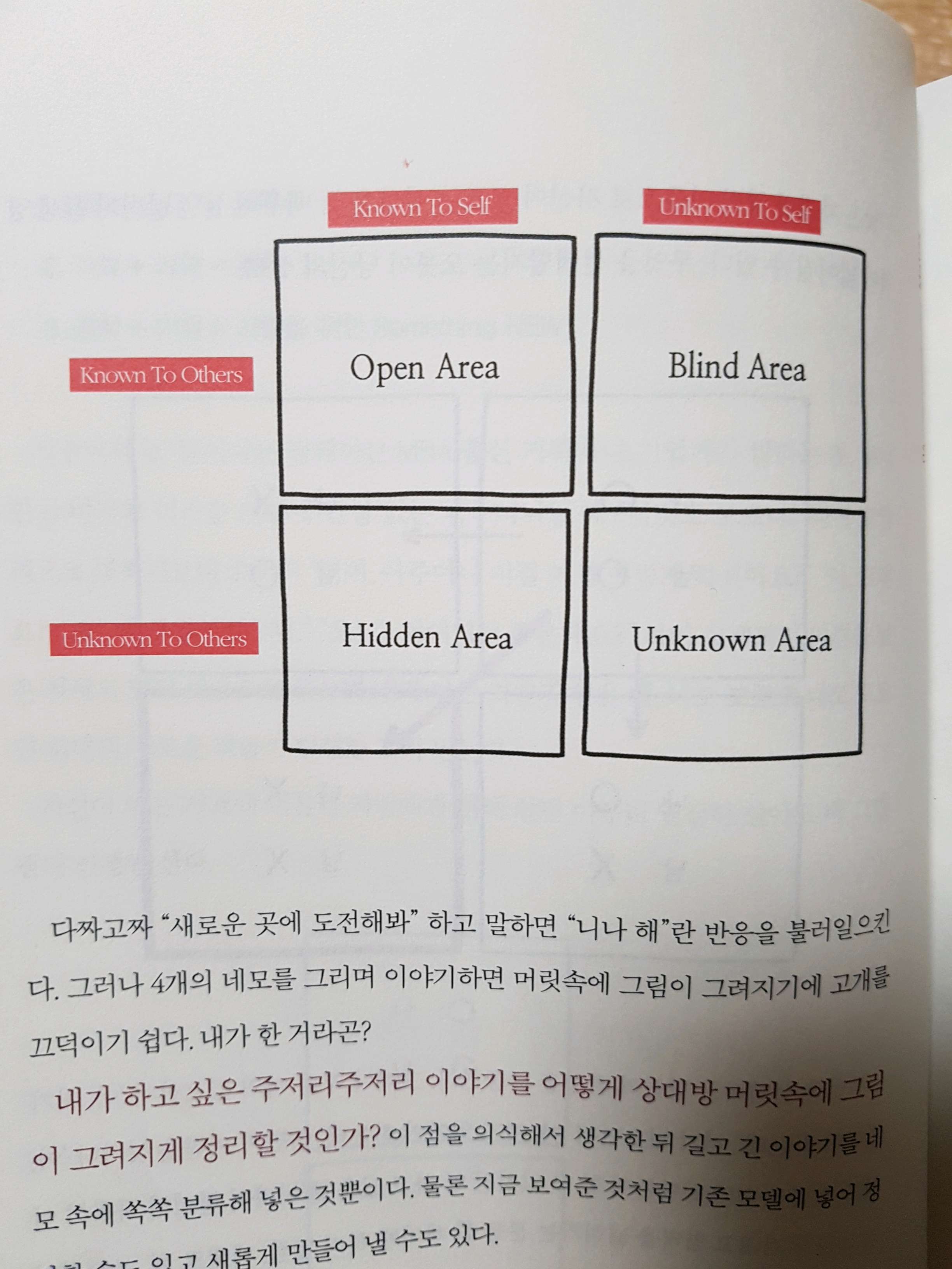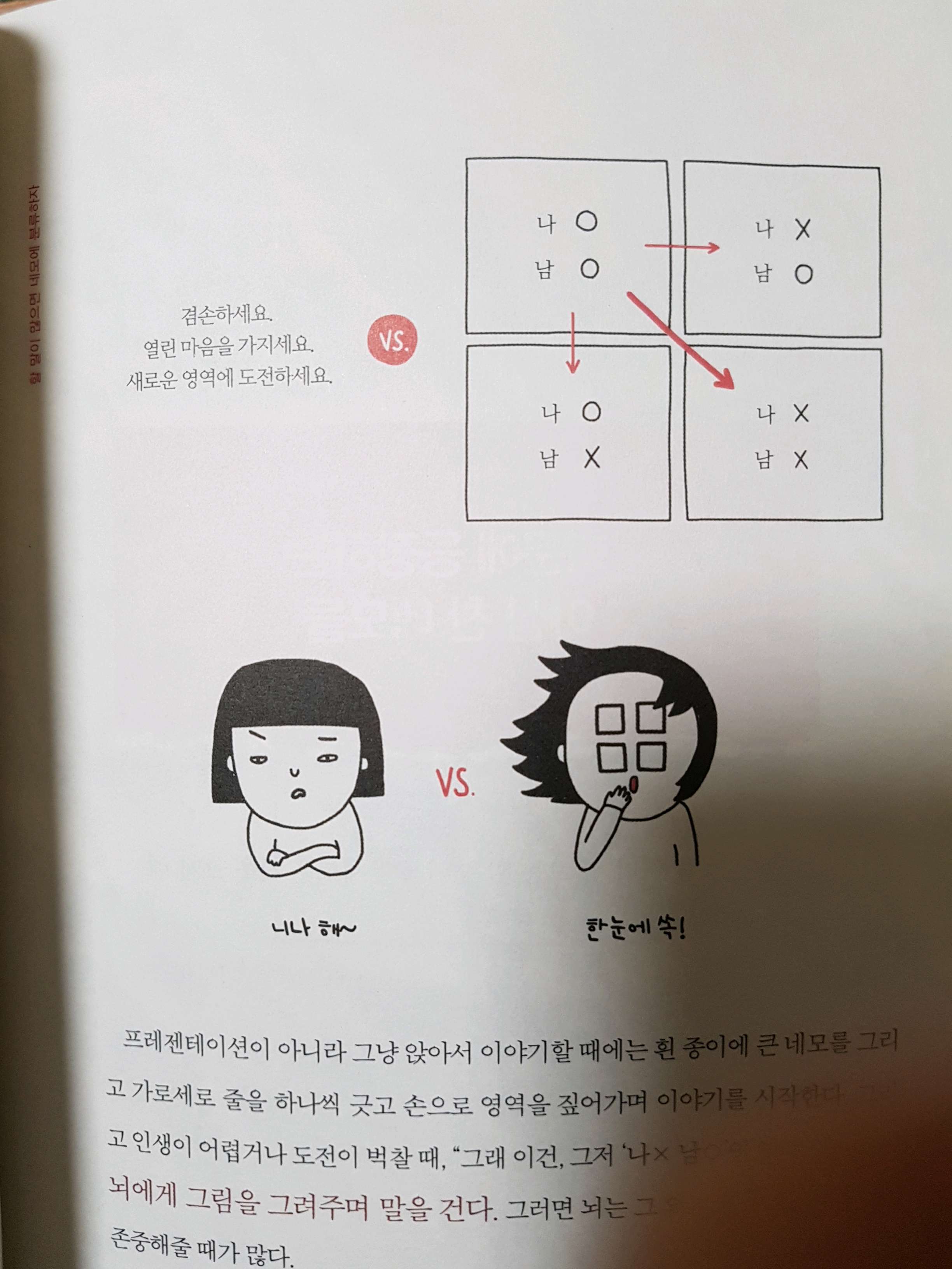 다짜고짜 "새로운 곳에 도전해봐"하고 말하면 "니나 해"란 반응을 불러일으킨다. 그러나 4개의 네모를 그리며 이야기하면 머릿속에 그림이 그려지기에 고개를 끄덕이기 쉽다. 내가 한거라곤?