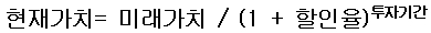현재가치 = 미래가치 / ( 1 + 할인률)^투자기간(승수)