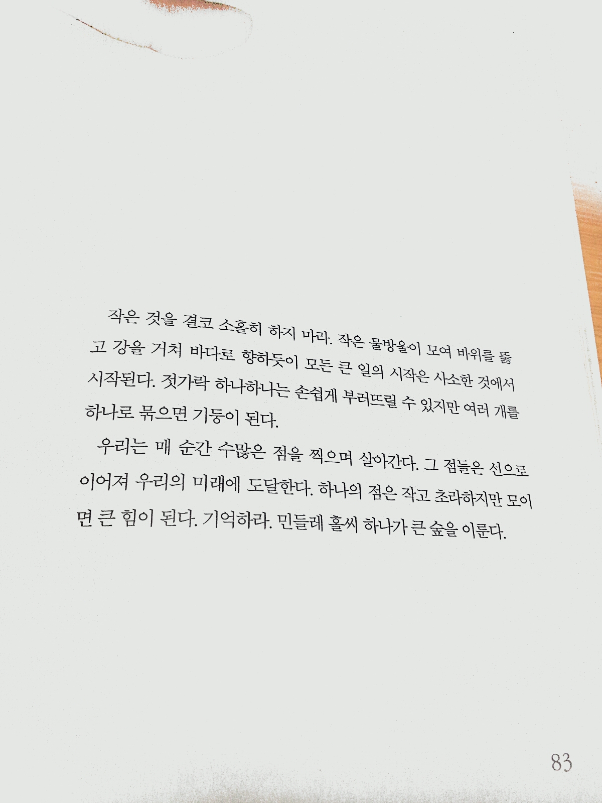 작은 것을 결코 소홀히 하지 마라. 작은 물방물이 모여 바위를 뚫고 강을 거쳐 바다로 향하듯이 모든 큰 일의 시작은 사소한 것에서 시작된다. 젓가락 하나하나는 손쉽게 부러뜨릴 수 있지만 여러 개를 하나로 묶으면 기둥이 된다.